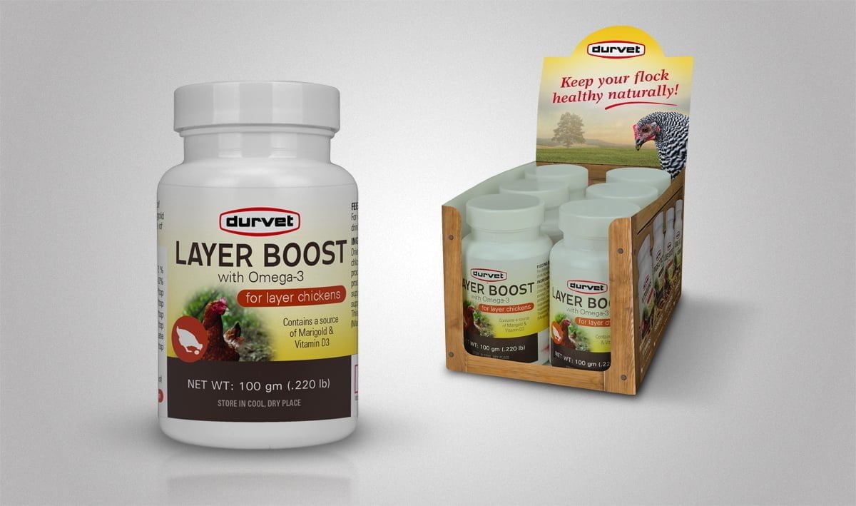 Layer Boost contains a blend of vitamins, electrolytes, enzyme, omega 3, and tagetes for layer chickens. Layer Boost also contains a source of live (viable) direct fed microorganisms.